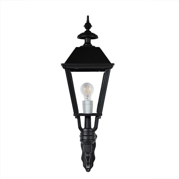 Armen og lanternen er lavet af solidt håndstøbt aluminium, hvilket gør denne facadelanterne nem at sætte fast på væggen. Facadelampen er pulverlakeret to gange for at opnå den bedste beskyttelse, med en mat sort strukturfarve, som giver en gammeldags, ægte fornemmelse. Denne klassiske lampe er populær, fordi materialet ikke ruster, og den er så vedligeholdelsesfri, en væglanterne i generationer. Klassisk facadebelysning er smuk ved din indgang, f.eks. ved dobbeltdøre.