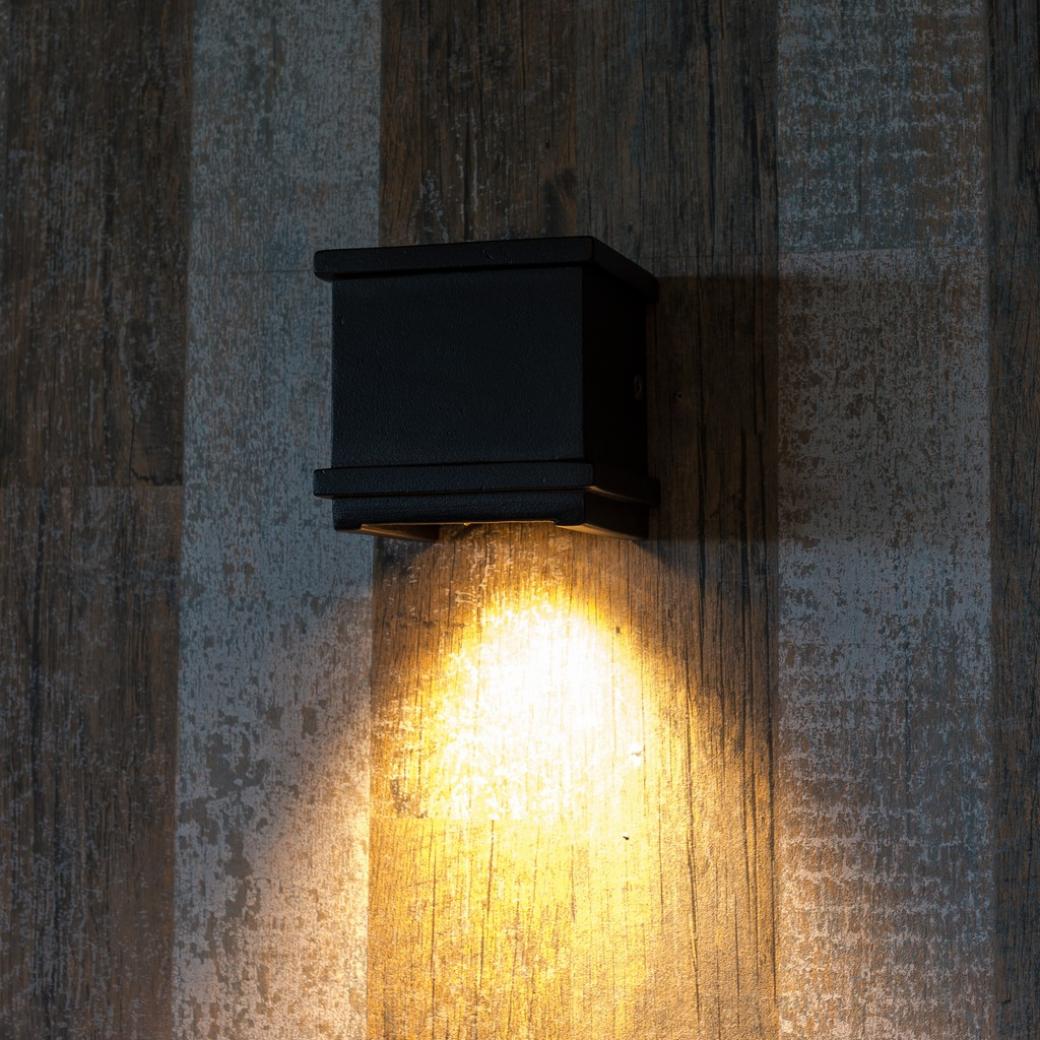 Robust vægbelysning, downlight. Nedadrettet lysudstråling skaber en markant glød på facaden eller planken. Denne belysning bliver også et smykke på din facade med sit stilfulde og sobre design.