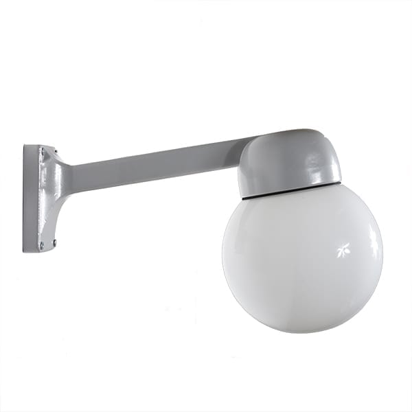 Dette funkis-armatur har en retrostil, der passer til alt fra gamle huse til huse i moderne eller funkis-stil. Armen er 28 cm ud fra væggen. Det runde glas er 15 cm i diameter. Det enkelte glas er 10 cm i diameter.