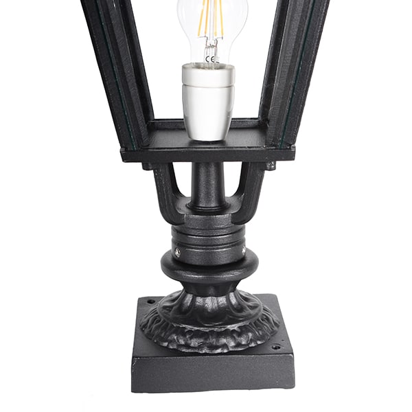 Vi har klassisk indkørselsbelysning både i det lettere støbte materiale aluminium og i det robuste, tungere materiale støbejern. Denne belysning er håndstøbt i massiv aluminium, hvilket gør den nem at montere. Den holdbare pulverlakering i en moderne sort mat farve betyder, at den har en meget god beskyttelse, og det faktum, at den er vedligeholdelsesfri, er ønsket af mange, og desuden ruster denne portlampe ikke. Glasset er ægte og giver en flot glød i mørket ved indgangen eller på portstolpen. En rigtig klassiker, der tåler tidens tand! Lampen har IP-nummer 23 og er CE-mærket. Lampefoden er i porcelæn og har en E27-fatning.