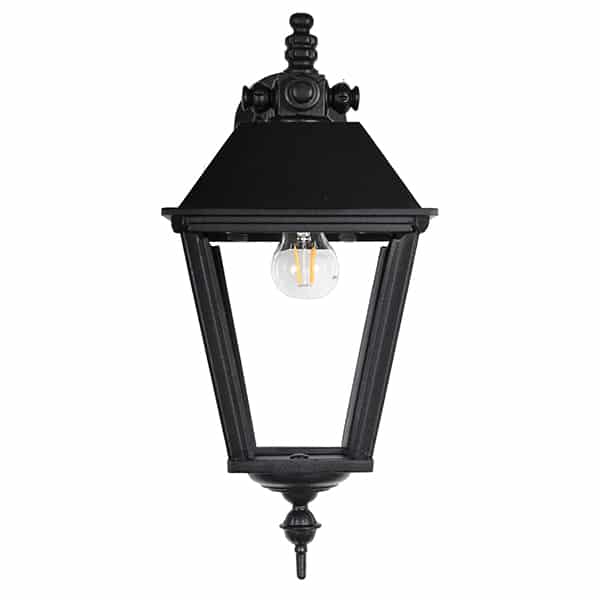 Armen og lanternen er lavet af solidt håndstøbt aluminium, hvilket gør denne udendørslampe nem at montere på væggen. Facadelampen er pulverlakeret to gange for at opnå den bedste beskyttelse, med en mat sort struktureret farve, som giver en gammeldags autentisk fornemmelse. Denne klassiske lampe er populær, fordi materialet ikke ruster, og den er så vedligeholdelsesfri, en væglampe i generationer. Denne klassiske udendørs væglampe er smuk mange steder, f.eks. over døre, ved siden af dørene ved indgangen eller på husets facade.