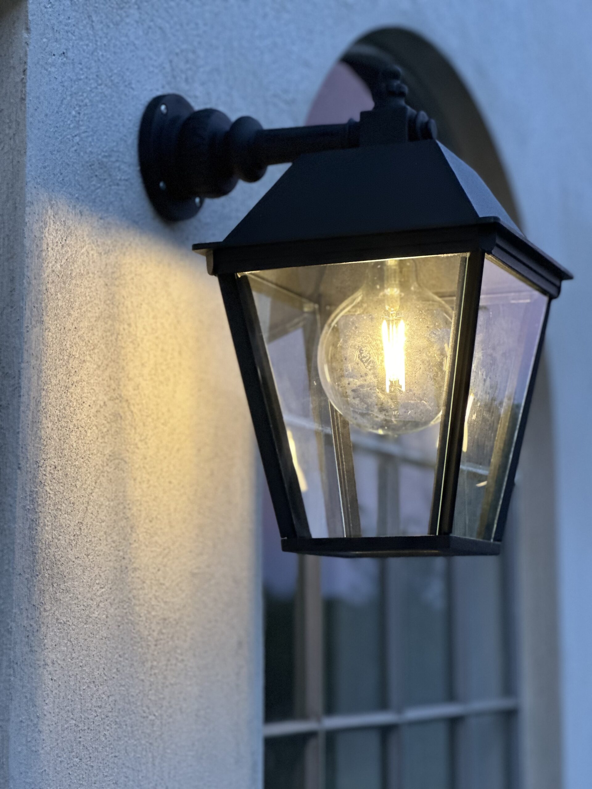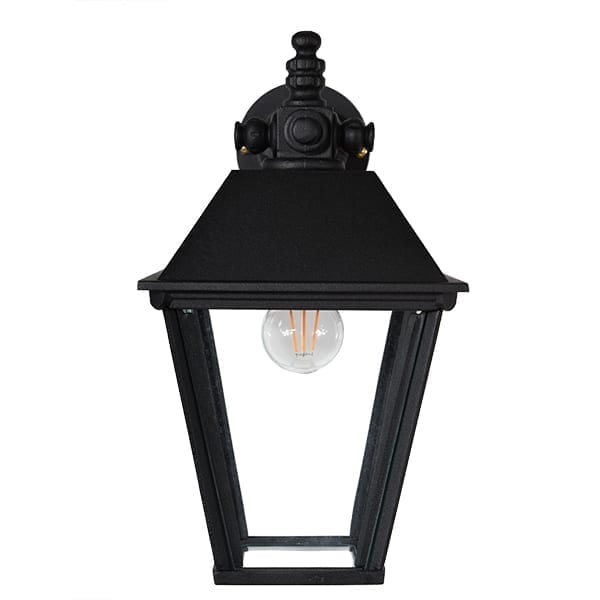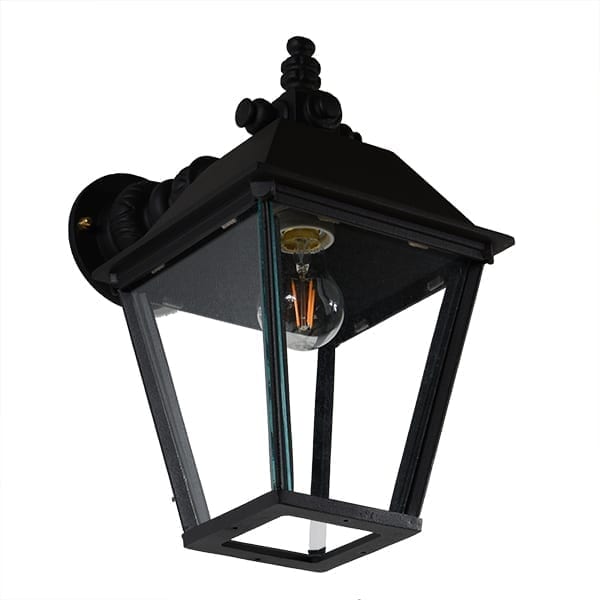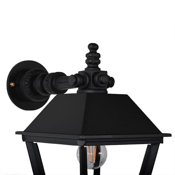 Armen og lanternen er lavet af solidt håndstøbt aluminium, hvilket gør denne udendørslampe nem at montere på væggen. Facadelampen er pulverlakeret to gange for at opnå den bedste beskyttelse, med en mat sort struktureret farve, som giver en gammeldags autentisk fornemmelse. Denne klassiske lampe er populær, fordi materialet ikke ruster, og den er så vedligeholdelsesfri, en væglampe i generationer. Denne klassiske udendørs væglampe er smuk mange steder, f.eks. over døre, ved siden af dørene ved indgangen eller på husets facade.