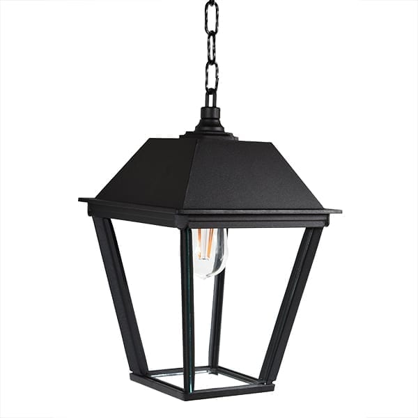 Lanternen er lavet af solidt håndstøbt aluminium, hvilket gør den nem at sætte op i loftet. Vores kædelanterne er pulverlakeret to gange for at opnå den bedste beskyttelse med en matsort struktureret finish, der giver en autentisk følelse af den gamle verden. Denne klassiske lampe er populær, fordi materialet ikke ruster, og den er så vedligeholdelsesfri, en væglanterne i generationer. Klassisk lanterne er smuk belysning på din veranda eller terrasse.