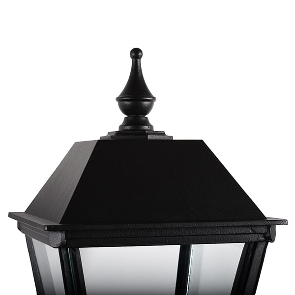 Vi har klassisk indkørselsbelysning både i det lettere støbte materiale aluminium og i det robuste, tungere materiale støbejern. Denne belysning er håndstøbt i massiv aluminium, hvilket gør den nem at montere. Den holdbare pulverlakering i en moderne sort mat farve betyder, at den har en meget god beskyttelse, og det faktum, at den er vedligeholdelsesfri, er ønsket af mange, og desuden ruster denne portlampe ikke. Glasset er ægte og giver en flot glød i mørket ved indgangen eller på portstolpen. En rigtig klassiker, der tåler tidens tand! Lampen har IP-nummer 23 og er CE-mærket. Lampefoden er i porcelæn og har en E27-fatning.