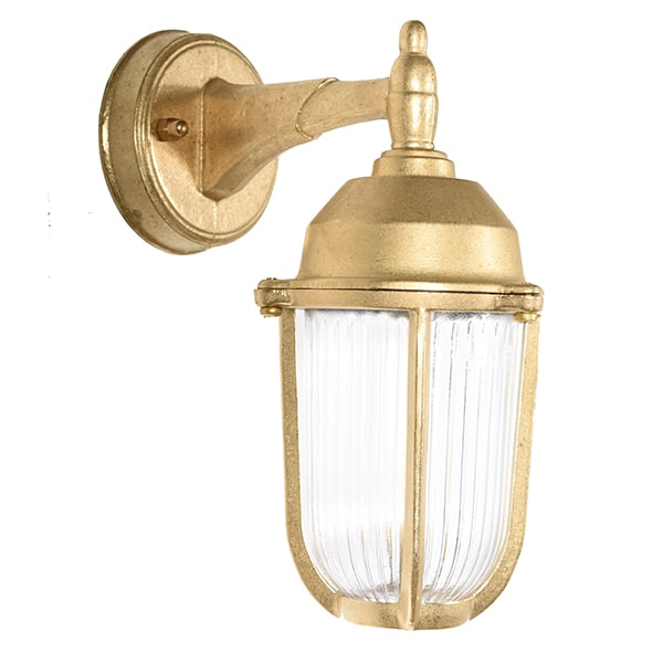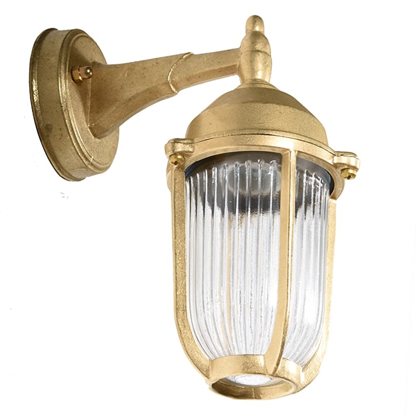 Robust væglampe i støbt messing. Glasset er klart og giver en flot glød i skumringen. Væglampen i messing passer godt i kystmiljøer, hvor saltholdigheden er højere i luften. Denne væglampe passer til mange stilarter, designet går i den marine retning. En lampe, som du har i mange år fremover, da den er lavet af et så godt og holdbart materiale, og messing bliver kun pænere med årene! IP 64, CE-mærket, E27-fatning.