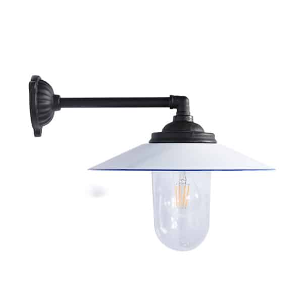 Lanterne i støbejern med skærme i emalje og kobber. Den hvide skærm har hvid emalje med mørkeblå striber. De sorte har en hvid bagside med en sort stribe. Kobberskærmen er poleret og ikke behandlet. Lavet efter en gammel model fra 1900-tallet. Almindelig udendørslampe i Sverige og Europa i denne periode, en af de mest almindelige. IP44 CE-mærket sikkerhed med jordforbindelse.