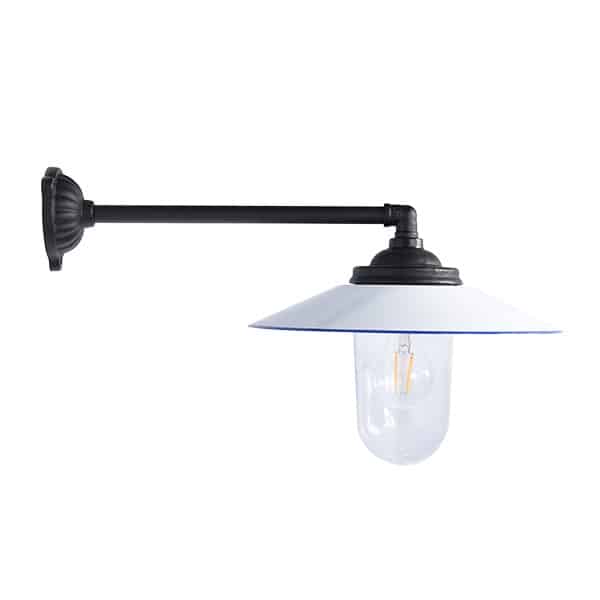 Lanterne i støbejern med skærme i emalje og kobber. Den hvide skærm har hvid emalje med mørkeblå striber. De sorte har en hvid bagside med en sort stribe. Kobberskærmen er poleret og ikke behandlet. Lavet efter en gammel model fra 1900-tallet. Almindelig udendørslampe i Sverige og Europa i denne periode, en af de mest almindelige. IP44 CE-mærket sikkerhed med jordforbindelse.