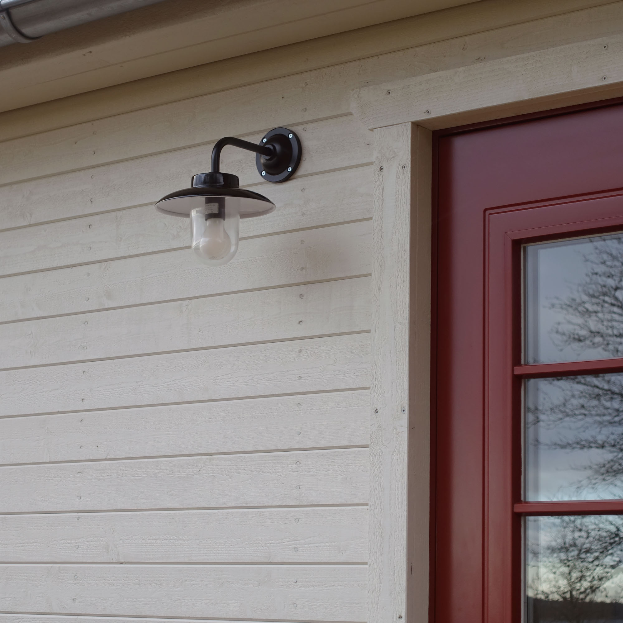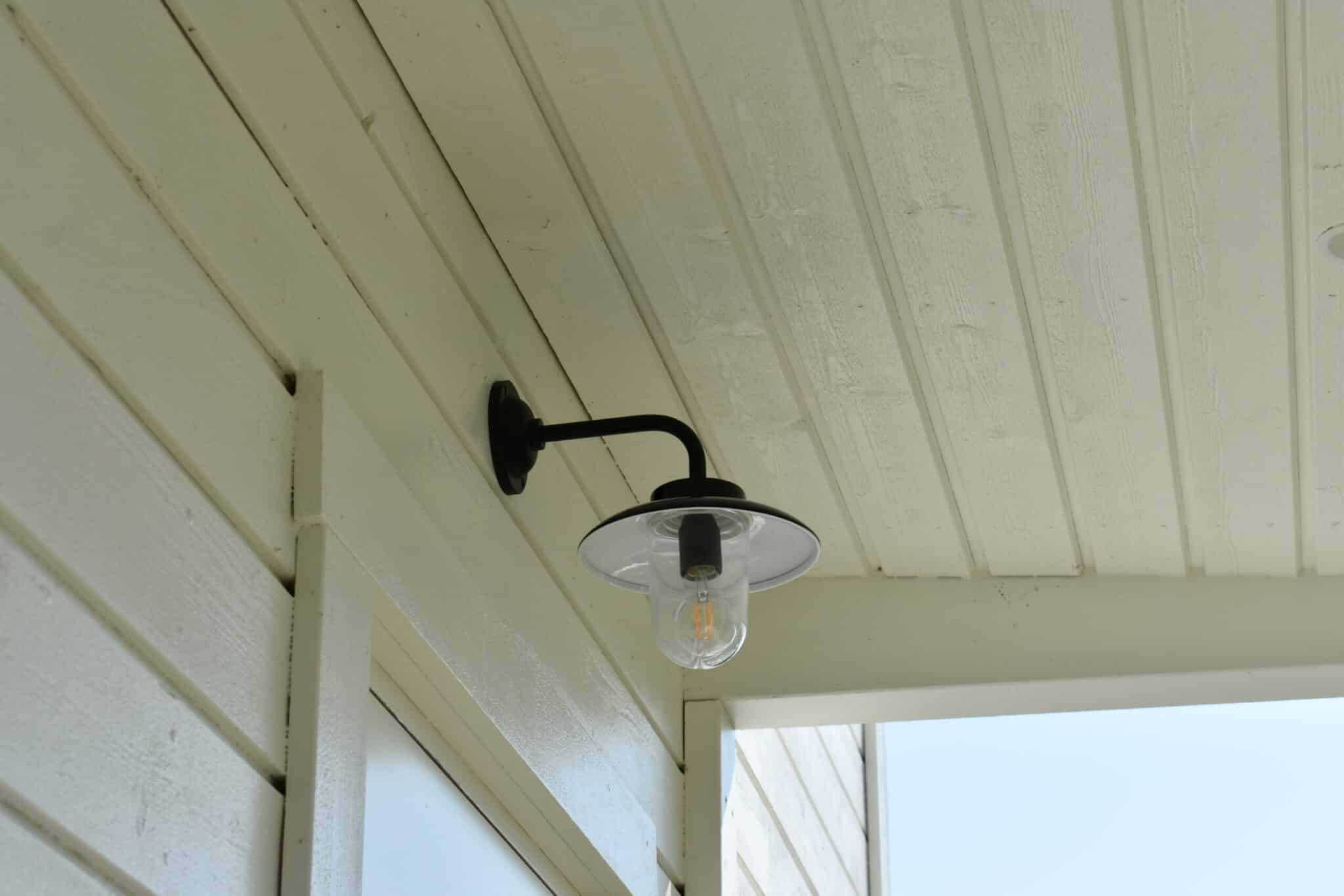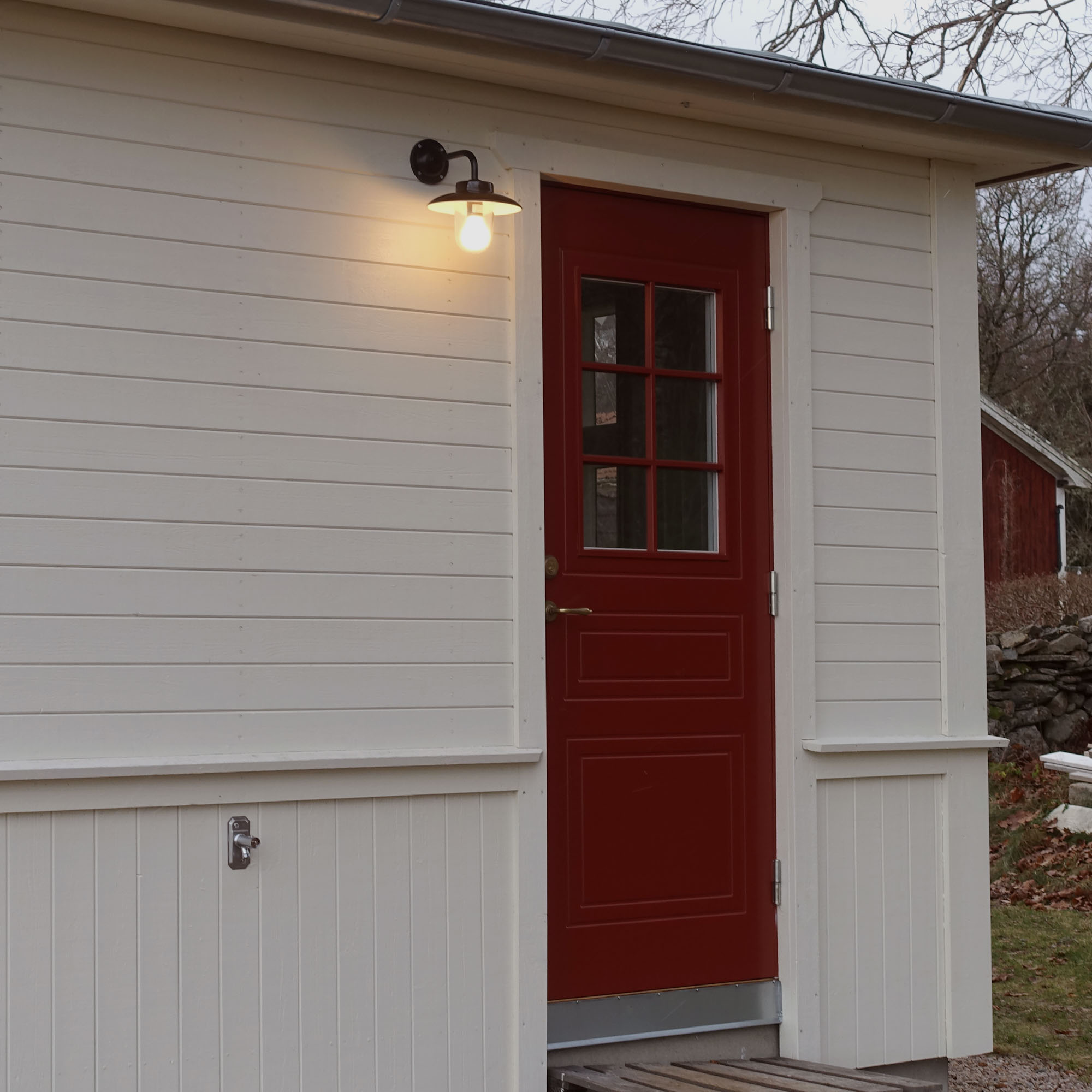 Kulturlampans staldlampe mini passer fint til både gamle og nyere huse. Her er lampen monteret ved siden af døren, den er meget indbydende og giver et godt lys, når man kommer hjem.