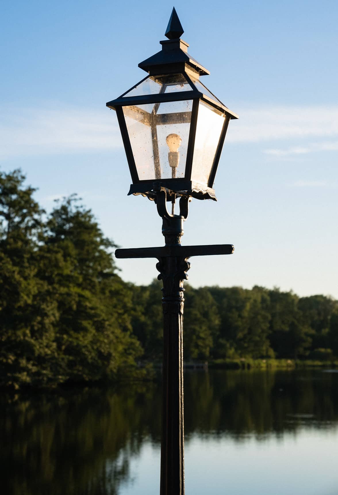 Vores støbejernspæl i et smukt bymiljø. Stolpen er i alt 420 cm høj.