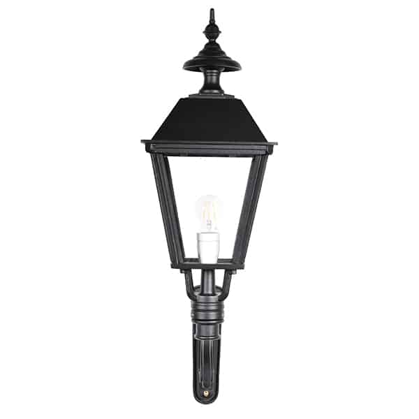 Armen og lanternen er lavet af solidt håndstøbt aluminium, hvilket gør denne facadelanterne nem at sætte fast på væggen. Facadelampen er pulverlakeret to gange for at opnå den bedste beskyttelse, med en mat sort strukturfarve, som giver en gammeldags, ægte fornemmelse. Denne klassiske lampe er populær, fordi materialet ikke ruster, og den er så vedligeholdelsesfri, en væglanterne i generationer. Klassisk facadebelysning er smuk ved din indgang, f.eks. ved dobbeltdøre.