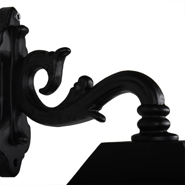 Armen og lanternen er lavet af solidt håndstøbt aluminium, hvilket gør denne udendørslampe nem at montere på væggen. Facadelampen er pulverlakeret to gange for at opnå den bedste beskyttelse, med en mat sort struktureret farve, som giver en gammeldags autentisk fornemmelse. Denne klassiske lampe er populær, fordi materialet ikke ruster, og den er så vedligeholdelsesfri, en væglampe i generationer. Denne klassiske udendørs væglampe er smuk mange steder, f.eks. over døre, ved siden af dørene ved indgangen eller på husets facade.