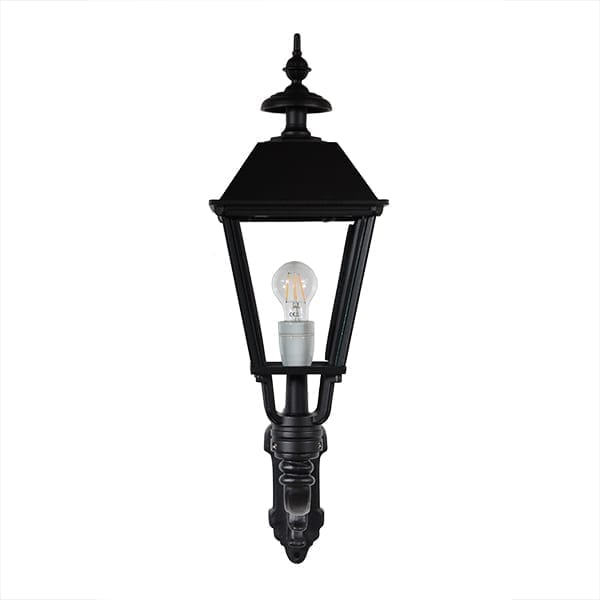 Armen og lanternen er lavet af solidt håndstøbt aluminium, hvilket gør denne facadelanterne nem at sætte fast på væggen. Facadelampen er pulverlakeret to gange for at opnå den bedste beskyttelse, med en mat sort strukturfarve, som giver en gammeldags, ægte fornemmelse. Denne klassiske lampe er populær, fordi materialet ikke ruster, og den er så vedligeholdelsesfri, en væglanterne i generationer. Klassisk facadebelysning er smuk ved din indgang, f.eks. ved dobbeltdøre.