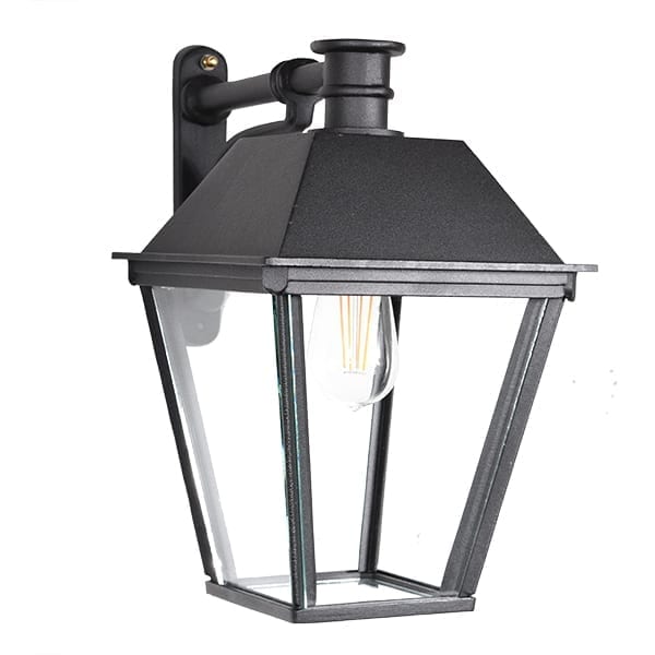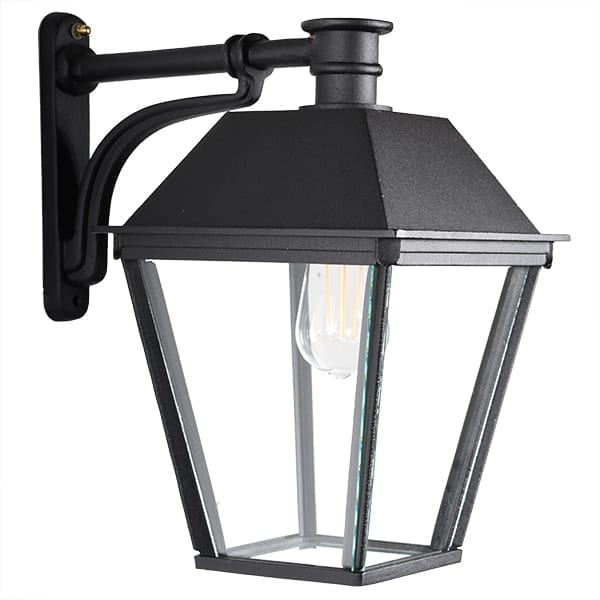 Armen og lanternen er lavet af solidt håndstøbt aluminium, hvilket gør denne udendørslampe nem at montere på væggen. Væglampen er pulverlakeret to gange for at opnå den bedste beskyttelse, med en mat sort struktureret finish, der giver en autentisk følelse af den gamle verden. Denne klassiske lampe er populær, fordi materialet ikke ruster, og den er så vedligeholdelsesfri, en væglampe i generationer. Denne klassiske udendørs væglampe er smuk mange steder, f.eks. over døre, ved siden af dørene ved indgangen eller på husets facade.